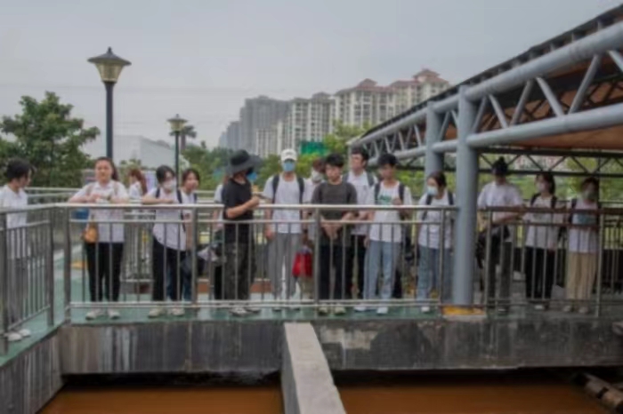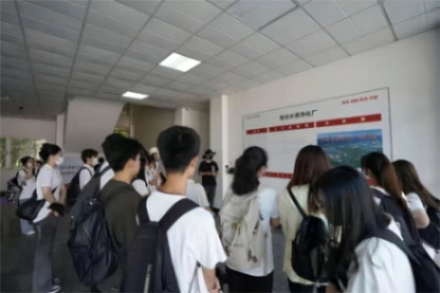 经过了一系列工艺流程的净化后,工程师在出水排放口采集了一杯“净水”,而其中还含有部分重金属,不可直接饮用。实践队员近距离见证了污水是如何通过一道道工序由浊变清的,真正见证了水资源的“再生”。