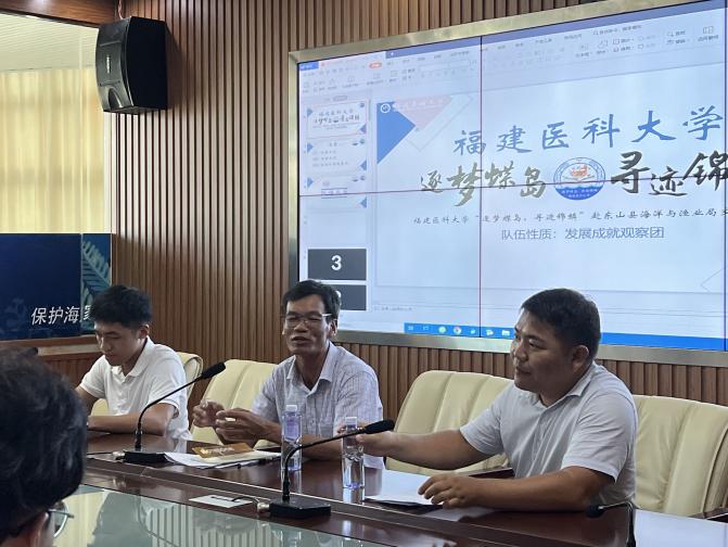 7月4号下午,福建医科大学基础医学院“逐梦蝶岛,寻迹锦鳞”三下乡实践队前往东山县海洋与渔业局,通过对海洋与渔业局、海渔执法大队访谈并交流感想,初步了解东山渔业的发展情况。