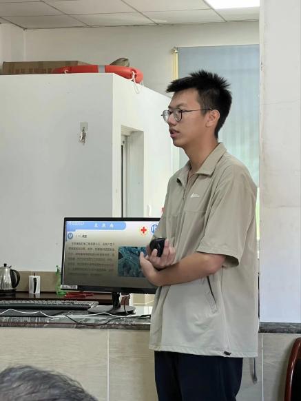 实践队与东山县红十字会提前联系,协商讲座安排,并请红会人员邀请渔民参与。在本次讲座中,实践队成员陈若凡从渔业职业病的种类及成因、防患措施、早期症状、现行治疗方法、愈后等方面,结合自身医学生身份发表见解与感想,回答渔民与讲座相关的问题。在讲座结束后,队员及红会成员与随机采访三位渔民,了解讲座举办成效,进行集体合影留念,并在渔民离开后及时清理场地。