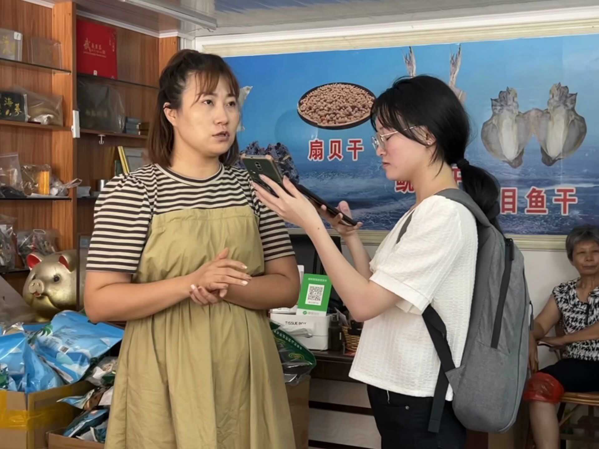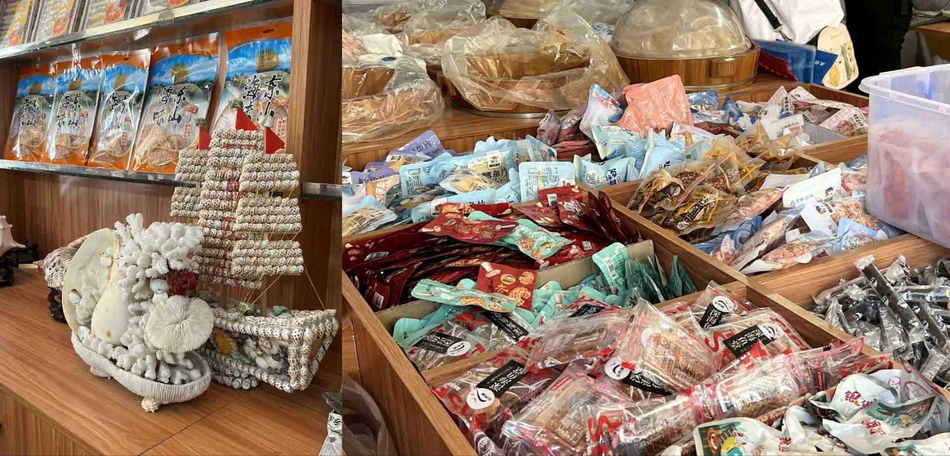 8号上午9:00,实践队前往铜陵镇商业街,参观当地水产干货店铺,在取得当地商铺老板的准许后,队员们品尝不同品类的海鲜干品,并在店铺老板的介绍下了解不同种类的水产干品,例如鱿鱼干、巴浪鱼干、紫菜等多种干品。同时,店铺老板也向我们分享了他们的销售渠道以及销售状况,提到了要结合旅游产业以及借助电商经营模式,将干品销售给游客并传播至全国各地。