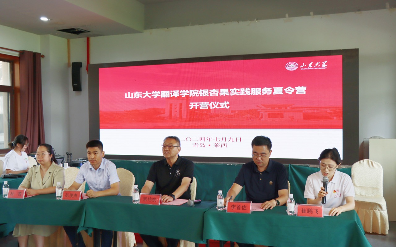 9日上午,银杏果实践服务团在东鲁农业生态公园举行了银杏果夏令营开营仪式。山东大学翻译学院党委副书记常伟东,莱西南墅镇党委副书记、镇长李首佐、共青团莱西市委副书记彭俊杰,共青团莱西市委相关负责人以及翻译学院全体辅导员共同出席了本次开营仪式,银杏果实践服务团学生志愿者以及全体学生营员共同参与了本次开营仪式。本次仪式由山东大学翻译学院团委负责人崔鹏飞主持。