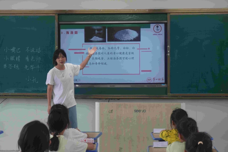为贯彻落实党的关于加强中小学生毒品预防教育工作,7月11日,湖南第一师范学院物理与化学学院“寻梦沅江,物化启航”教育关爱服务团队成员为孩子们带来了一堂毒品安全教育课程。