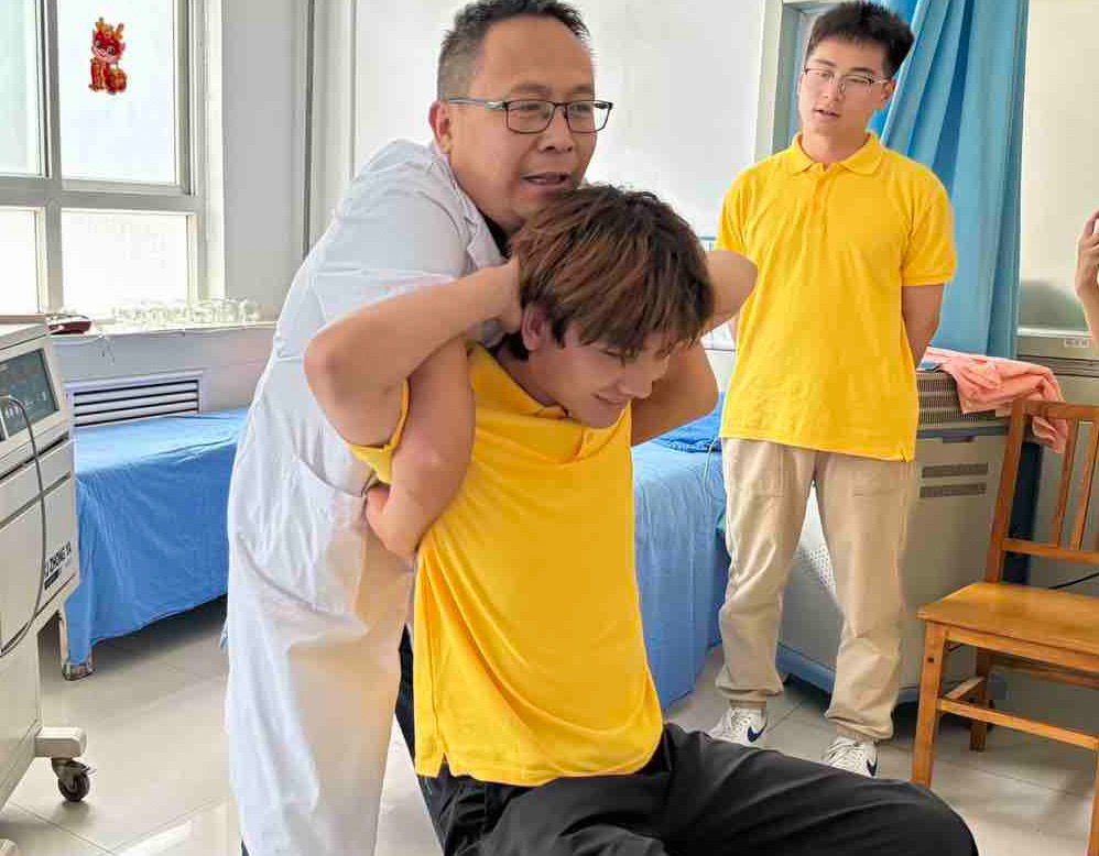 (图为指导医生为志愿者演示腰部酸软拉伸手法)