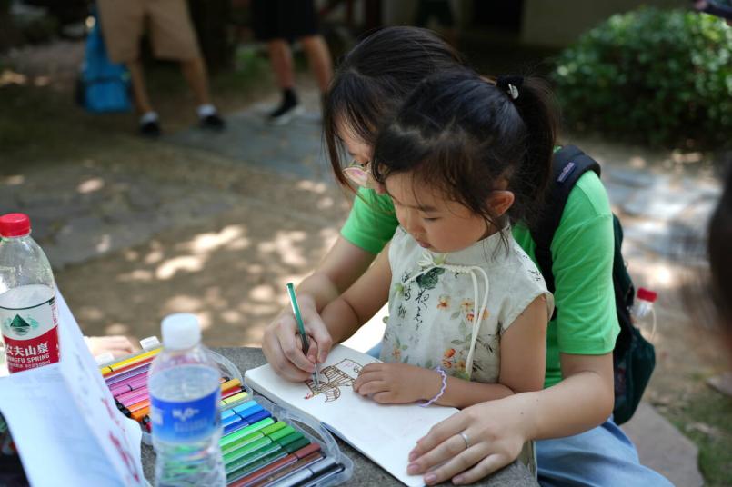 图为华农实践团队员指导小朋友画爱晚亭。通讯员 吴宣仪 摄