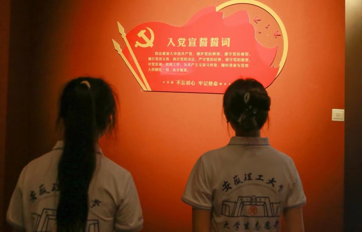 (图为队员志愿服务队队员阅读入党宣誓誓词)