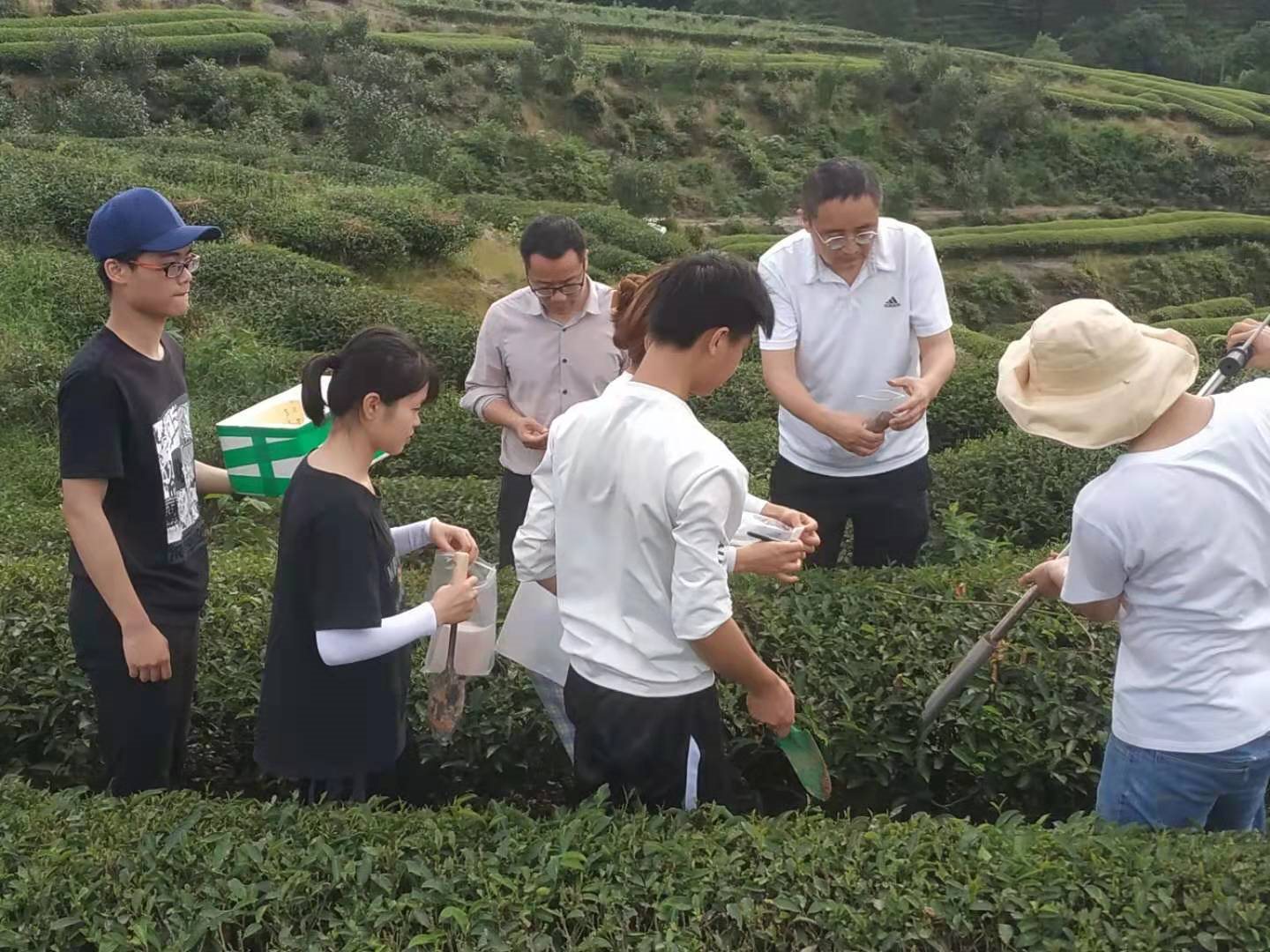 图为指导老师带领团队成员在茶园中进行土壤采样