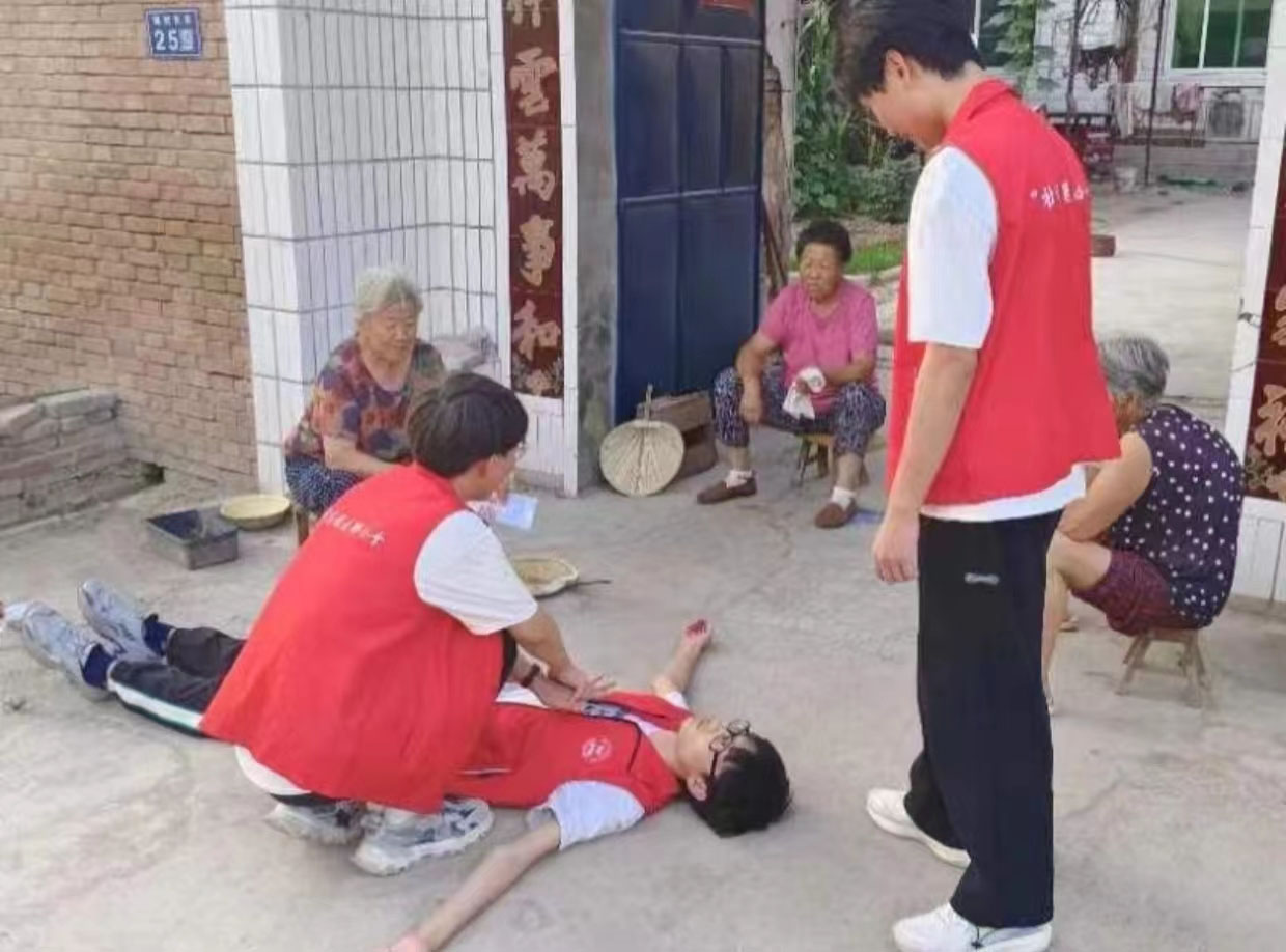 七月十四日,团队成员再次走进村庄向村民们进行急救方式的科普和演习。其中包括止血包扎.骨折固定等。为加深群众的印象和了解,以自身为示范。在众多急救方法中,成员们着重演示了心肺复苏并指导村民们自行尝试。