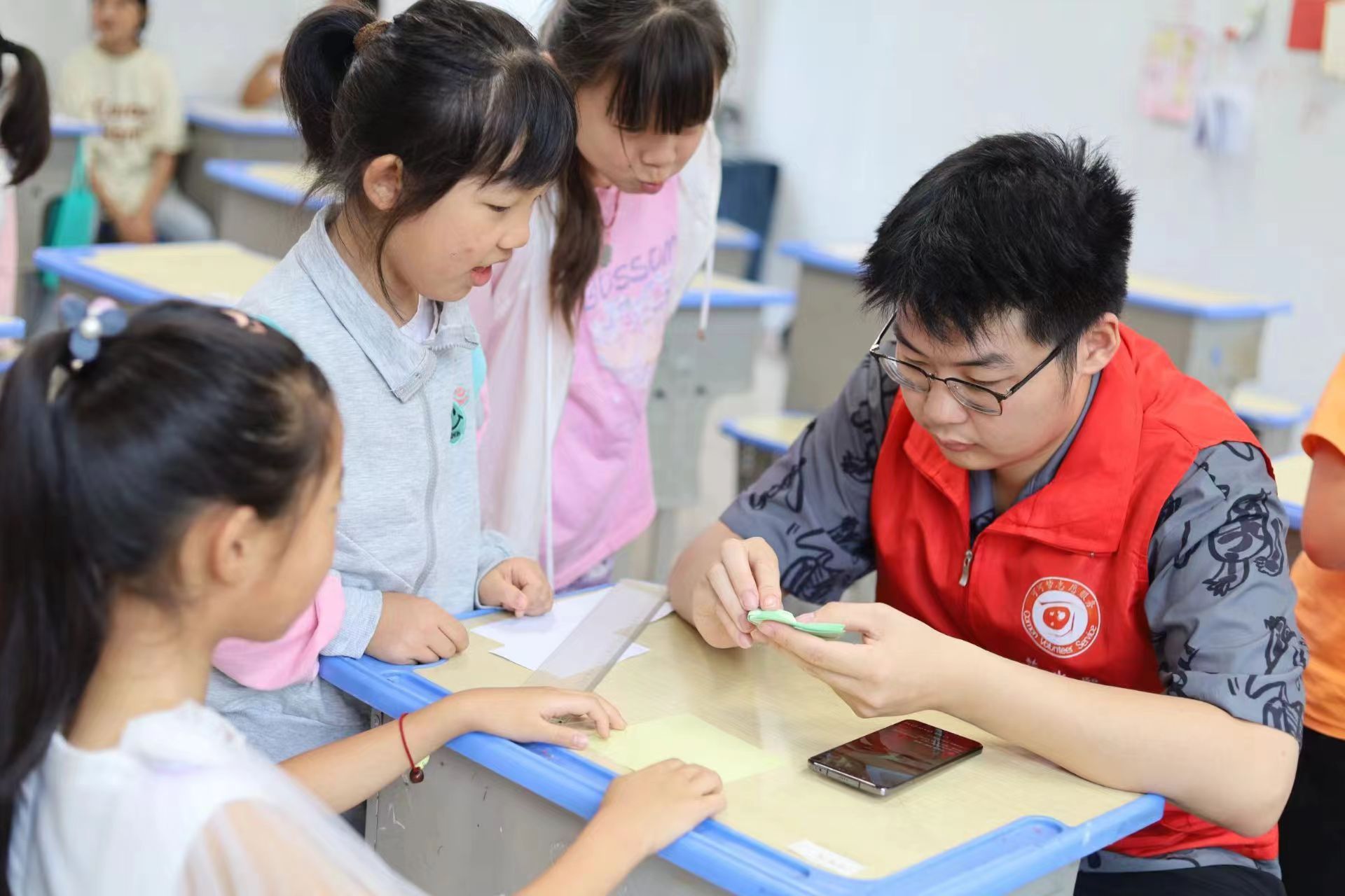 图为志愿者在教学生们折纸。 多彩大学生网通讯员 隆莹莹 供图