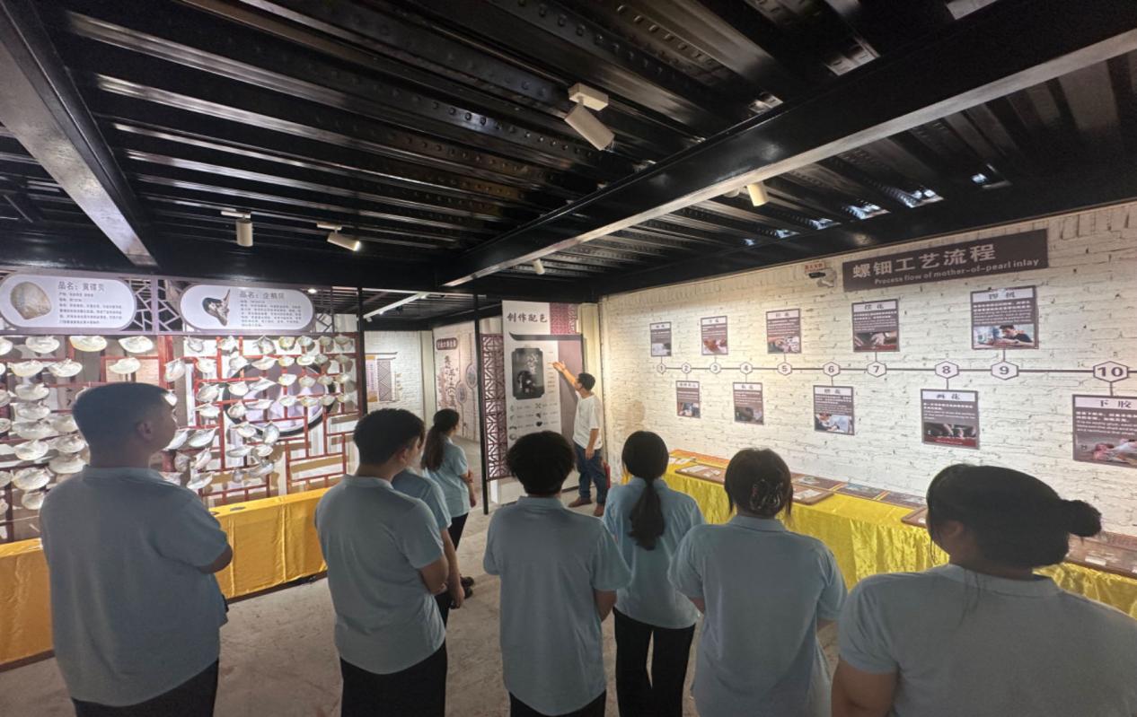 图2 非遗传承人带领实践队参观图 据红运当头艺术生活馆主理人介绍,螺钿工艺是中国历史悠久的传统艺术瑰宝,起源于商代,经过数千年的发展,逐渐形成了独特的艺术风格和技艺特点。近年来,随着海上丝绸之路的国家倡议提出,我国与东南亚各国经贸往来快速发展,非遗螺钿制品凭借其独特的艺术魅力和深厚的文化内涵,成功敲开了东南亚市场的大门。据了解,我国传统非遗螺钿工艺制品在东南亚市场取得令人瞩目的出口成果,为中华传统文化的传播和国际贸易的繁荣增添了新的光彩。