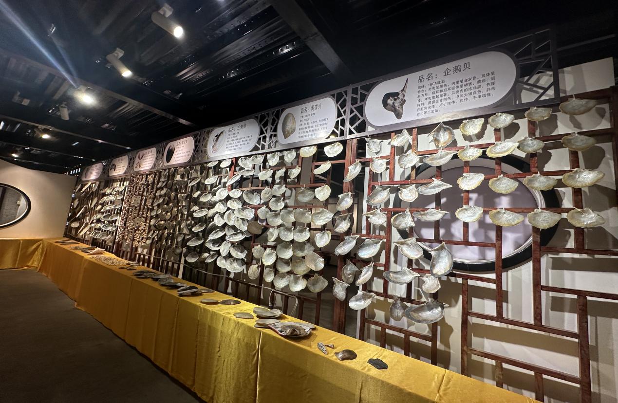图3 馆内陈列的制作螺钿原料 随后,实践队成员在传承人的带领下参观了制作工序环节,工匠们将打磨好的螺钿薄片按照设计的图案小心地镶嵌在器物表面。这需要精准的眼力和细腻的手法,确保螺钿片与器物完美贴合,不留缝隙。为了使镶嵌更加牢固,还使用特制的胶水或粘合剂。