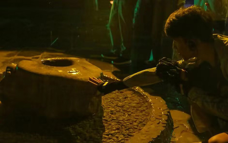 志愿者在触碰水滴石 (钟启豪 摄)