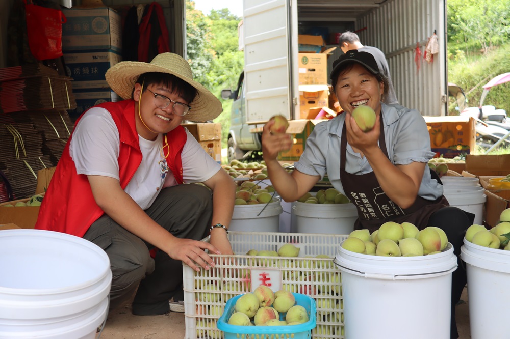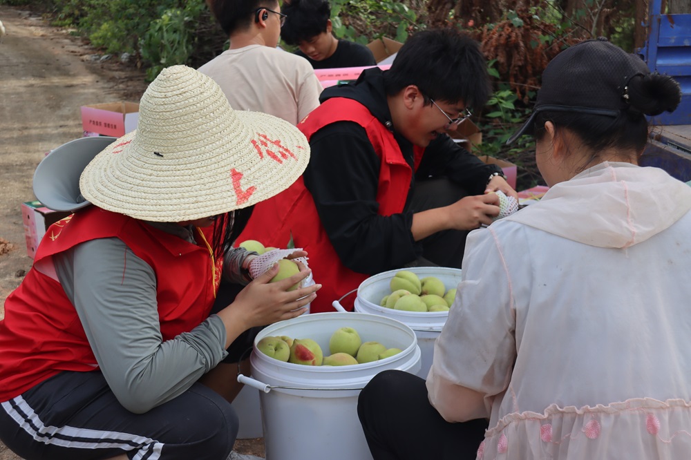 在郭福娣的指导下,队员们学习到了判断桃子成熟的标志以及采摘的手法,迅速开展了桃子采摘工作。桃子摘来后要进行选果,郭福娣为队员们详细演示了选桃方法,太小的不行,碰伤的、有烂斑的难保存,郭福娣告诫大家要精心挑选,争取把最好的桃子选出来卖给客户。“干我们这行,诚信是最重要的,人家花了这么多钱,咱们也要把最好的果子发给人家。”队员们按照郭福娣的方法认真选果、包装,大家纷纷表示,深刻体会到了脆甜的鹰嘴桃背后果农的辛苦付出,也充分认识到了乡村振兴与“助农兴农”密不可分。