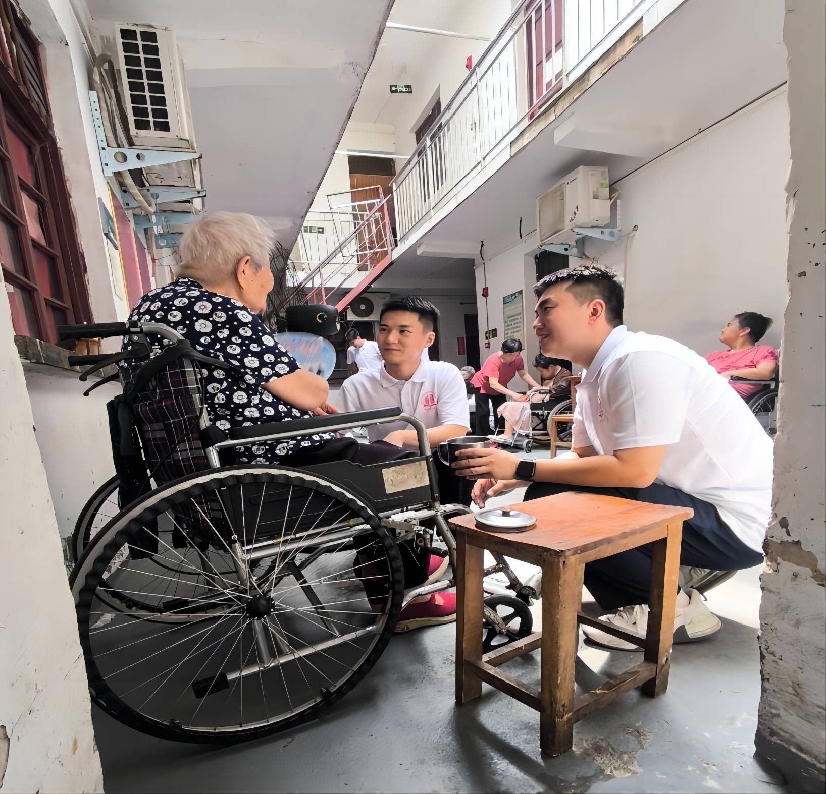 图为志愿者们细心询问老人身体状况,关心老人生活情况。