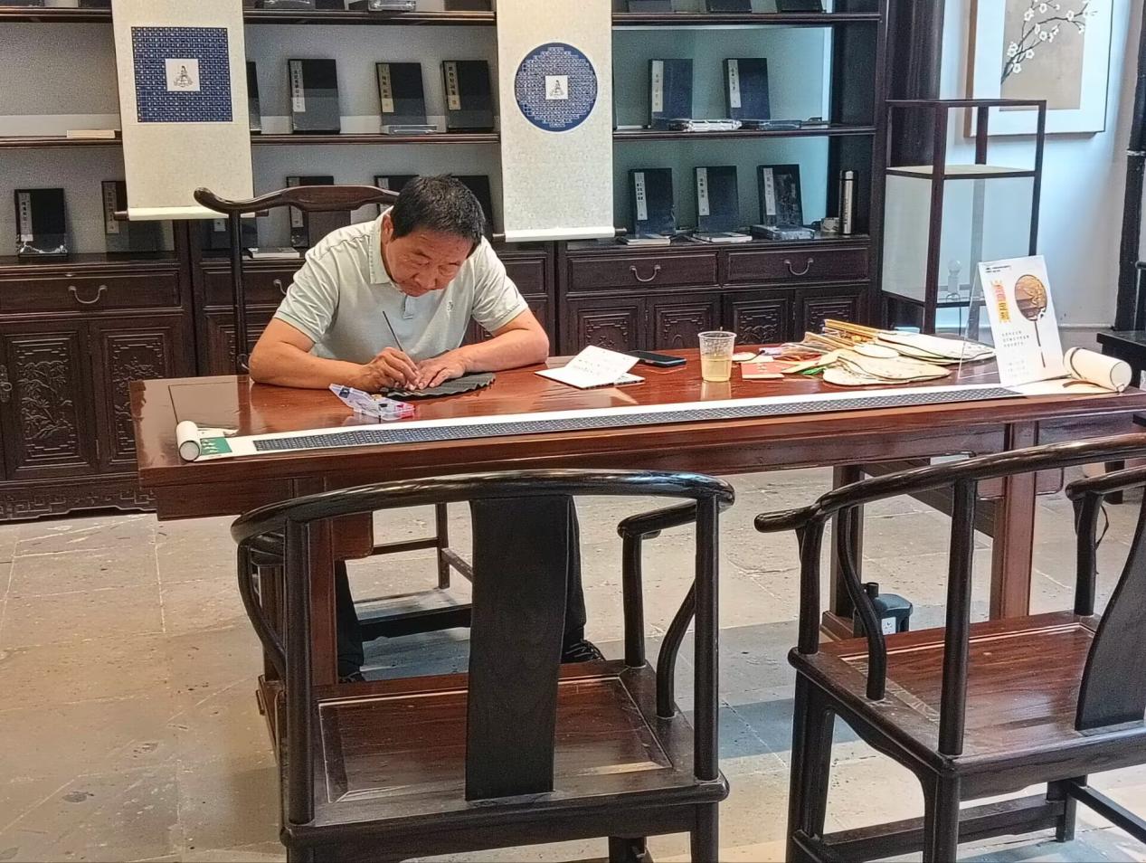 在参观的过程中,我还遇到了一位正在描金的老先生。他手持毛笔,蘸取调配好的金粉溶液,轻轻涂抹在墨条表面,看似简单的动作,却对毛笔的控制和角度有一定的要求,需以稳定的姿势,确保金粉均匀、细腻地附着在墨条表面。后续通过了解,墨条描金的步骤分为准备阶段、清洁墨条、调配金粉、描金、晾晒、检查与修饰、完成与保存,每一步都需要认真仔细,不容差错,极考验细心以及耐心。