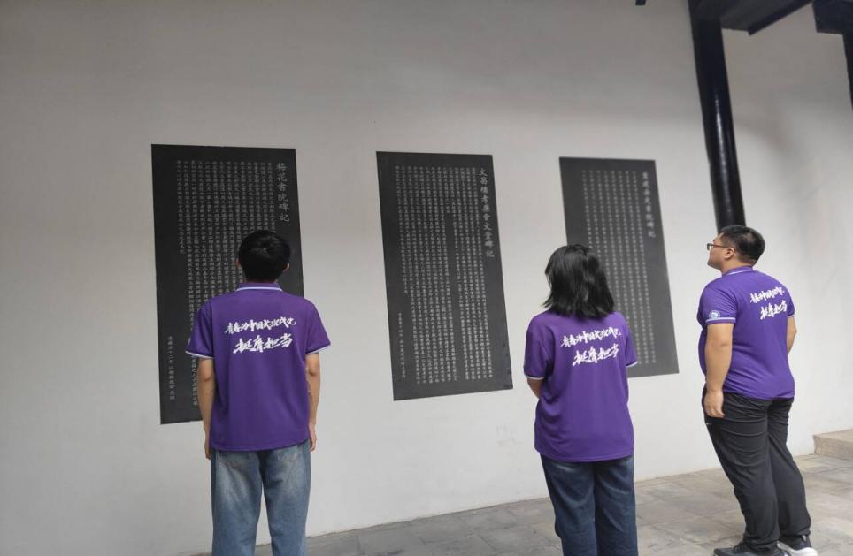 图为7月20日“非遗瑰宝映古今,文房四宝绘书法”暑期社会实践团团员陈朝晖、吴紫妍、朱文龙正在参观碑记。陈晨供图)