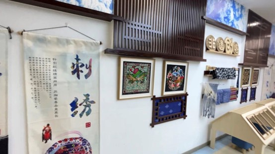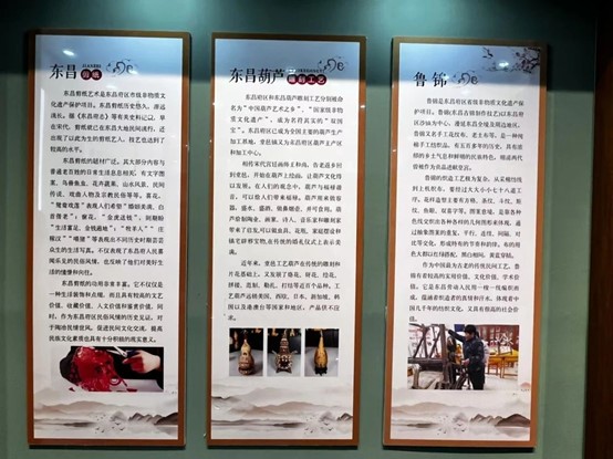 (图为道口铺非遗博物馆中有关东昌葫芦雕刻与鲁锦的介绍)
