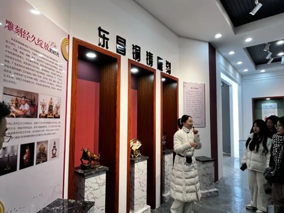 在道口铺非遗博物馆里,调研团成员了解到除了陶艺、木板年画外,东昌府区还有东昌葫芦、毛笔、东昌铜铸雕刻、东昌澄泥、叶雕等多种非遗文化,收获颇丰。