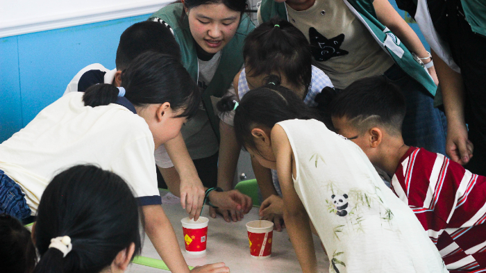 图为实践队成员带领小朋友们做实验