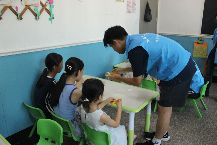 图为实践队成员教小朋友们做手工