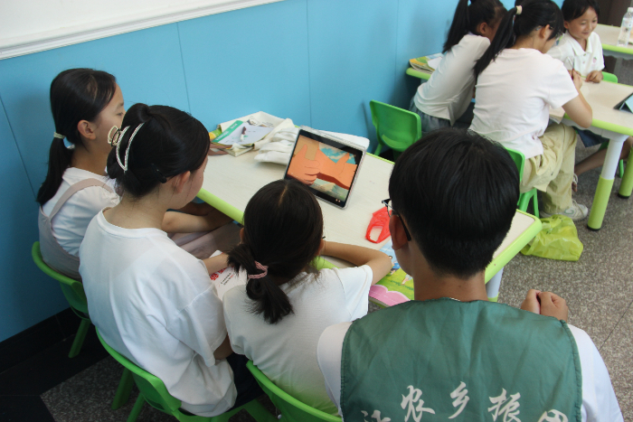 红色教育,启迪心灵。实践队采取混龄教育模式,组织开展诗歌朗诵和动画观影,通过视听艺术帮助孩子们厚植爱国情怀。低龄组朗诵夏明翰《就义诗》,感悟家国情怀;高龄组朗诵李大钊《青春》,传承革命精神。在观看红色动画《少年英雄王二小》时,原本热闹的教室一下子鸦雀无声,孩子们个个凝神静观。