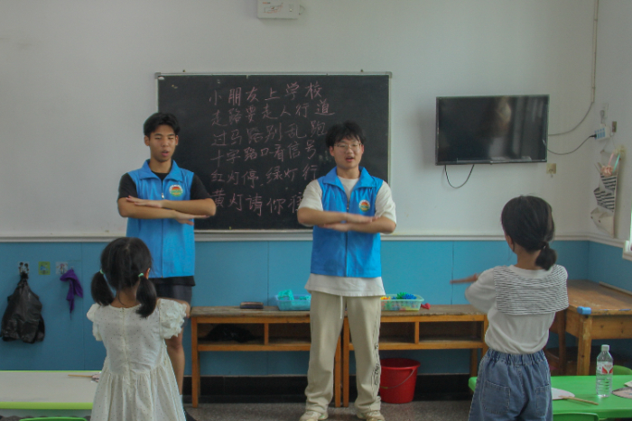 图为实践队成员带领小朋友们做交通安全操