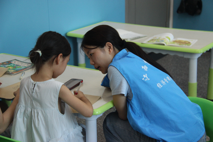 图为实践队成员辅导小朋友写作业
