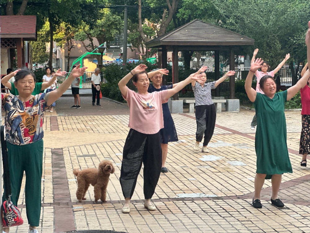 (团队成员带着社区老人跳广场舞,杜夏摄)