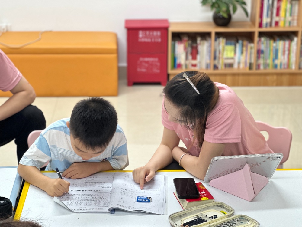 “课业加油站”作为此次暑期实践活动的特色项目,自开营以来从未停歇。经过一周多以来的相处,社区小朋友与安徽师大实践团队的“小老师们”已建立起融洽自然的关系。课堂上,在“小老师们”持续传递知识干货,通过相关提问启发小朋友们发散思维、主动思考,克服学习道路上的难题。课间时间,“小老师们”也时刻观察小朋友动向,服务小朋友们的各项需求,与小朋友一同参与手作软泥、123木头人、老鹰捉小鸡等放松性游戏。这种“陪伴式辅导”不仅为为孩子们的课业学习提供了切实帮助,更在潜移默化中拉近了师生距离,让社区小朋友们的暑期时光充满温暖与动力。
