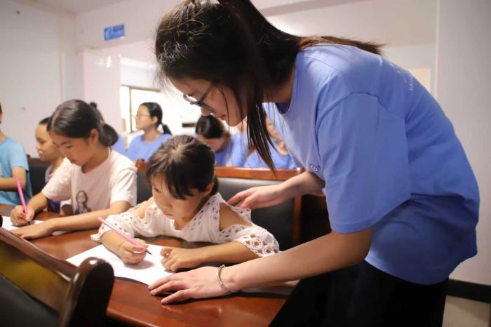 图为身着蓝色队服的实践队员正俯身指导儿童进行绘画创作。
