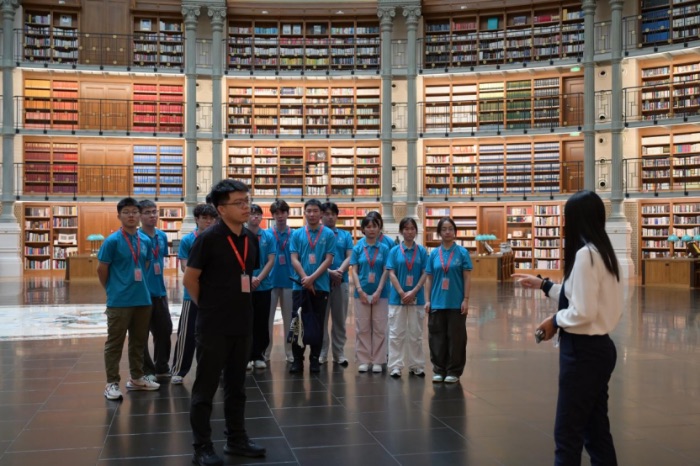 随后,师生前往华为东莞松山湖基地参观。在溪村园区,队员们沉浸在欧洲小镇的科技人文融合氛围中,搭乘华为“智慧小火车”穿梭维罗纳拱桥、海德堡城堡等欧式建筑群,体验华为“自然与科技共生”的园区设计理念;在三丫坡园区,队员们走进三丫坡图书馆,图书馆巨型圆形穹顶由对称的16组巨型铜铸罗马柱构成,形成16个拱形扇区,360度的环绕书架,里面的每一本书都蕴藏着岁月的沉淀,展现出华为对技术深耕与终身学习的重视。