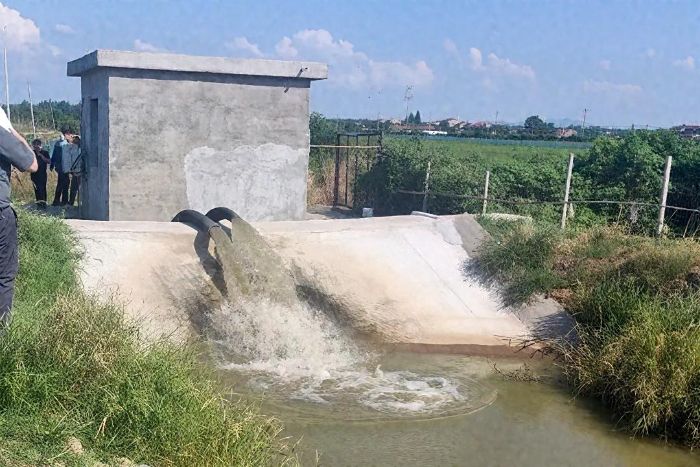 图为永喜养殖有限公司的养殖尾水正被排入“四池三坝”净化系统进行净化处理。李弘 供图 这一工艺的核心流程为:虾塘尾水先流入沉淀池,让残饵、虾粪等大颗粒杂质自然沉降;随后进入过滤池,借助水生植物与微生物进一步净化水质;接着流入曝气池,通过增加水体溶氧量,加速有机污染物的分解;最后在清水池中储存,等待抽回虾塘循环利用。而连接四个池子的三道坝体,则层层拦截杂质,确保尾水得到深度净化。