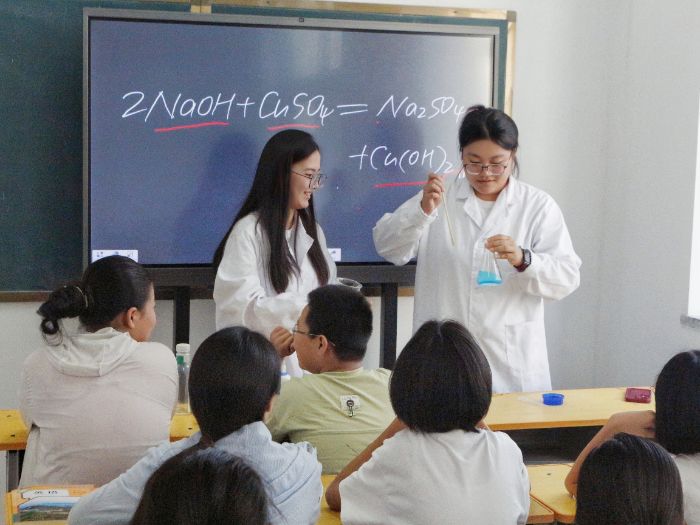 “科学探究无尽处,英雄壮志绘长空。”在科普教学环节,实践团成员曾昭彤以"如何在烧杯中构建微观世界"的提问引导学生们探索化学实验的奥秘,引发他们的浓厚兴趣。讲台上,锥形瓶、滴管、硫酸铜等实验器具与试剂整齐摆放,随后,实践团成员王晓玉、曾昭彤严格遵循实验规程,先将氢氧化钠溶液注入烧杯,吸取一定量硫酸铜溶液加入其中。随着硫酸铜溶液的逐滴加入,蓝色氢氧化铜沉淀瞬间生成,这一显著的化学反应现象,生动诠释了化学变化的魅力,令在场学生赞叹不已。