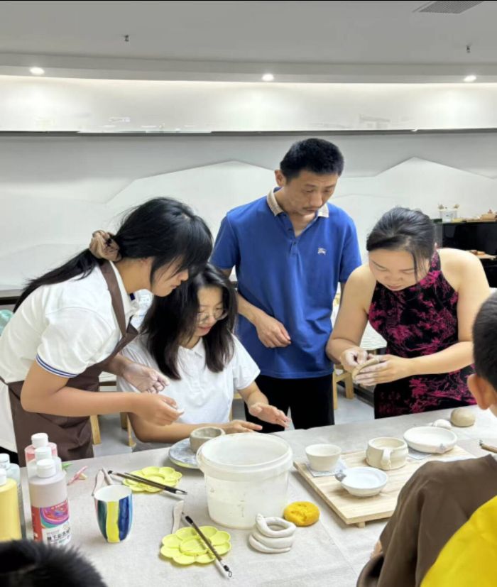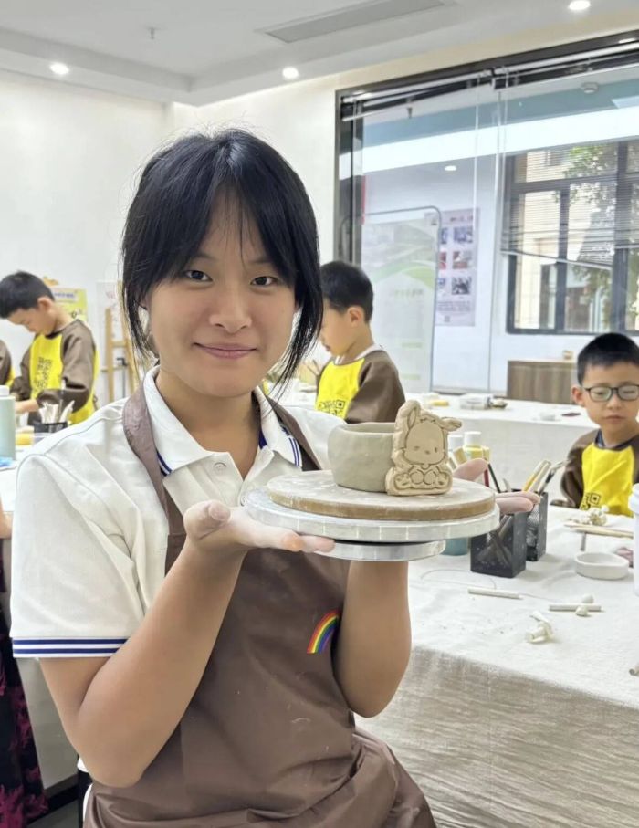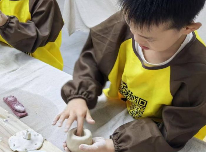 老师讲解显真功 接着进入关键的塑形环节,陈老师以做杯子为例,首先将陶泥揉搓成圆柱体,并且使底部趋于平整。“接下来一只手护住,另一只手沾蘸水,水可以增加陶泥湿度,减少塑形时的阻力并避免干裂,然后从圆柱体顶端中心位置开始,用拇指逐步向内按压、拓展,让内壁变得光滑,当然底部留厚点才稳。”陈晓悦老师边讲解边演示。大胆实践显创意小队成员和小朋友们围在工作台大胆创作,有人做精致小巧的茶杯,有人做奇思妙想的茶壶。数名老师穿梭指导,“裂了的地方就加点水修补”,在各位老师的帮助下,一个个满是心意的雏形冒了出来,虽说“奇形怪状”,却藏着大家的创意。