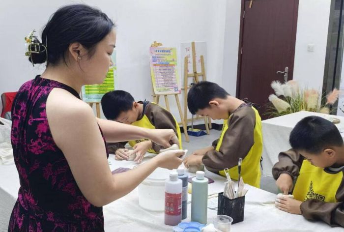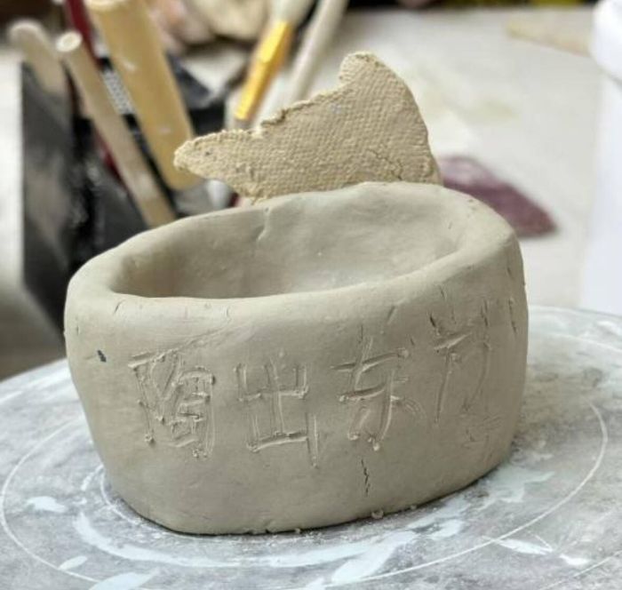 完成初步的塑形,就要进行装饰和修整了。陈老师拿出木制刻刀和模具,“可以用刻刀刻出简单纹饰,比如弧线、平行线,也能发挥创意画图案,也可以用自己喜欢的模具刻出图案。”我们跟着用刻刀轻划,写下“陶出东方”这四个字,给彩陶添上独特印记;小朋友虽然笔触稚嫩,却满是童真。传承不只是复刻,大家的创意也是彩陶文化的新活力。