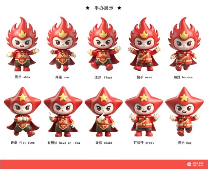 2.IP延展:意态多元 “星火”“薪晨”不仅命名寓意深远,团队更围绕其性格与身份,开发了丰富多元的表情系统、动态动作与主题服饰。无论是“星火”坚毅眼神的细腻刻画,还是“薪晨”服装上融入的地方传统纹样,每一处细节都凝聚着团队的匠心巧思。这些生动形象极富传播力,精准契合了当下新媒体环境中表情包、文创产品等内容形态的传播需求,为传统文化符号注入现代情感表达的活力。