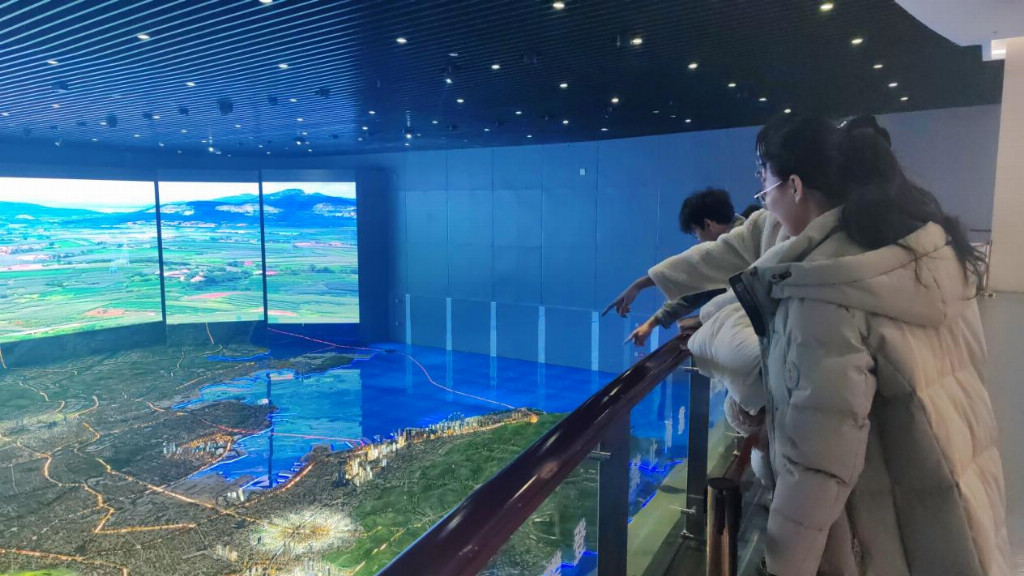 实践团成员前往大连市城市规划展示中心学习。序厅巨幅时间轴将1899年建港、1945年解放、1984年沿海开放、2019年“海洋中心城市”定位依次铺陈;核心区沙盘与立面影像同步点亮,青泥洼渔村—港口东迁—金普新区—太平湾合作创新区的空间跳跃一目了然。讲解员向实践团成员重点介绍了“2025年海岸线公共化率≥80%”“钻石湾—梭鱼湾海洋活力走廊”等目标,使成员们对“港—产—城”互动脉络与官方尺度有了直观的把握。