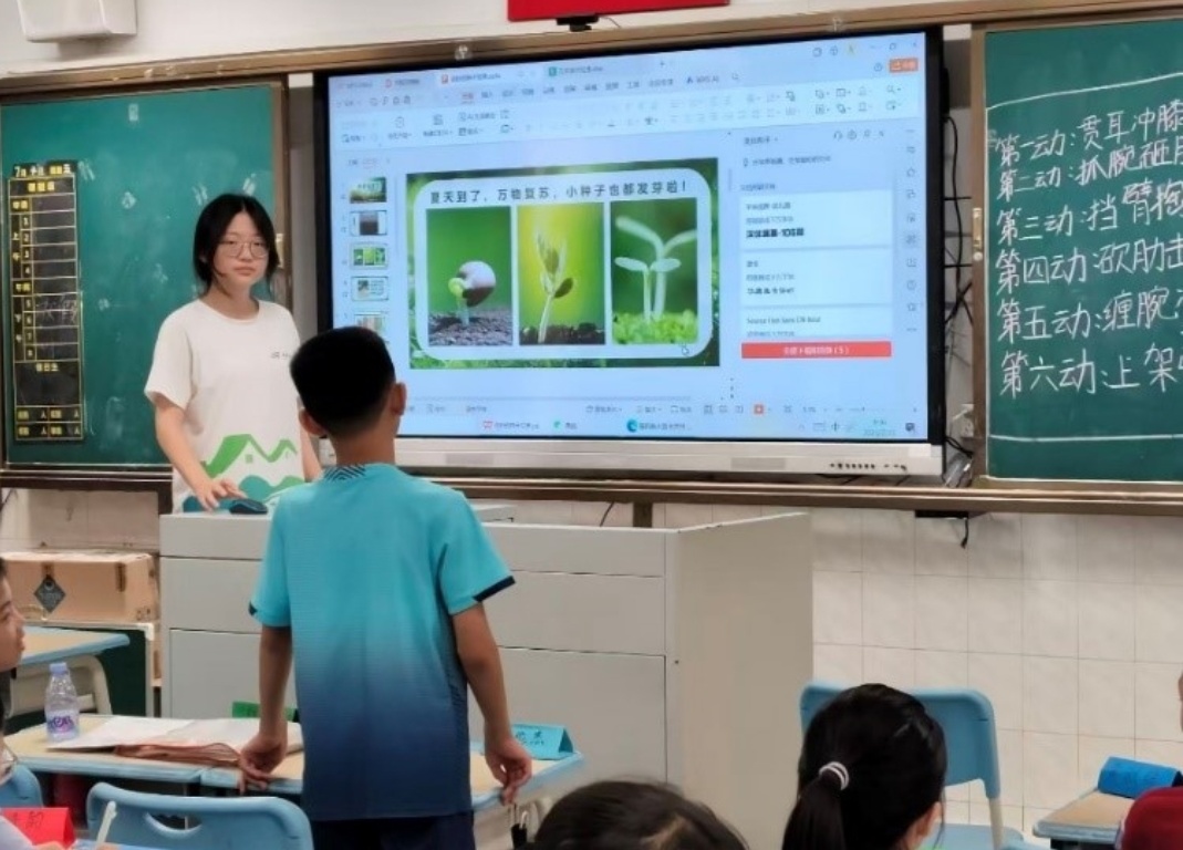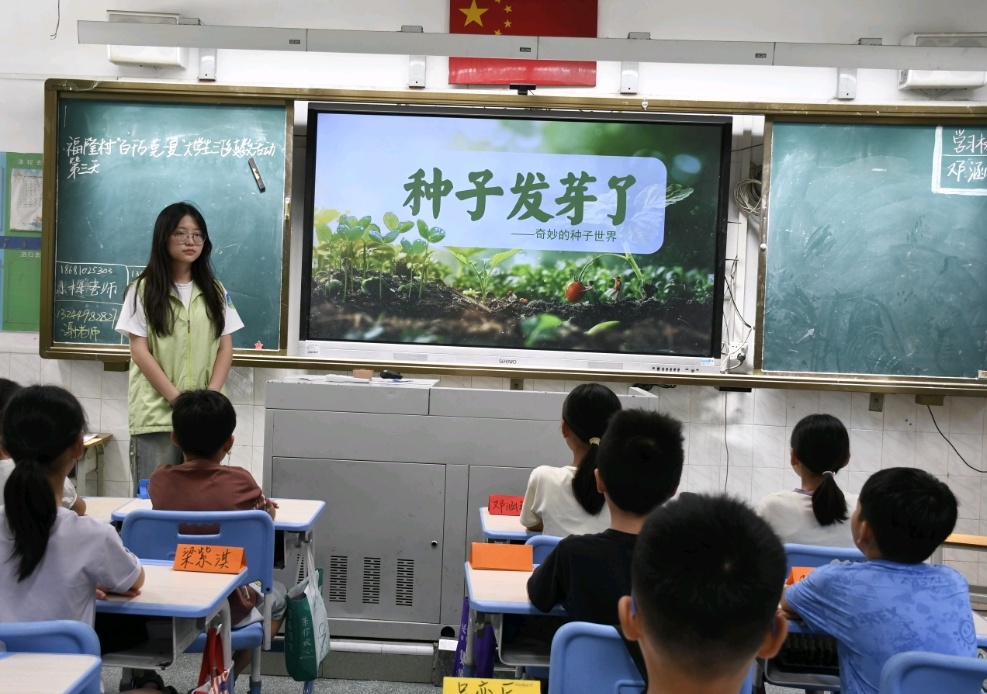 7月11日,宣讲人梅青萍在东莞石排镇福隆小学开展“种子发芽了・探秘奇妙种子世界”科普课程。课程摒弃传统理论灌输模式,以“知识讲解+实物观察+视频探究+动手实践”的沉浸式形式,带领50余名学生走出课本,感受植物生长的神奇魅力。