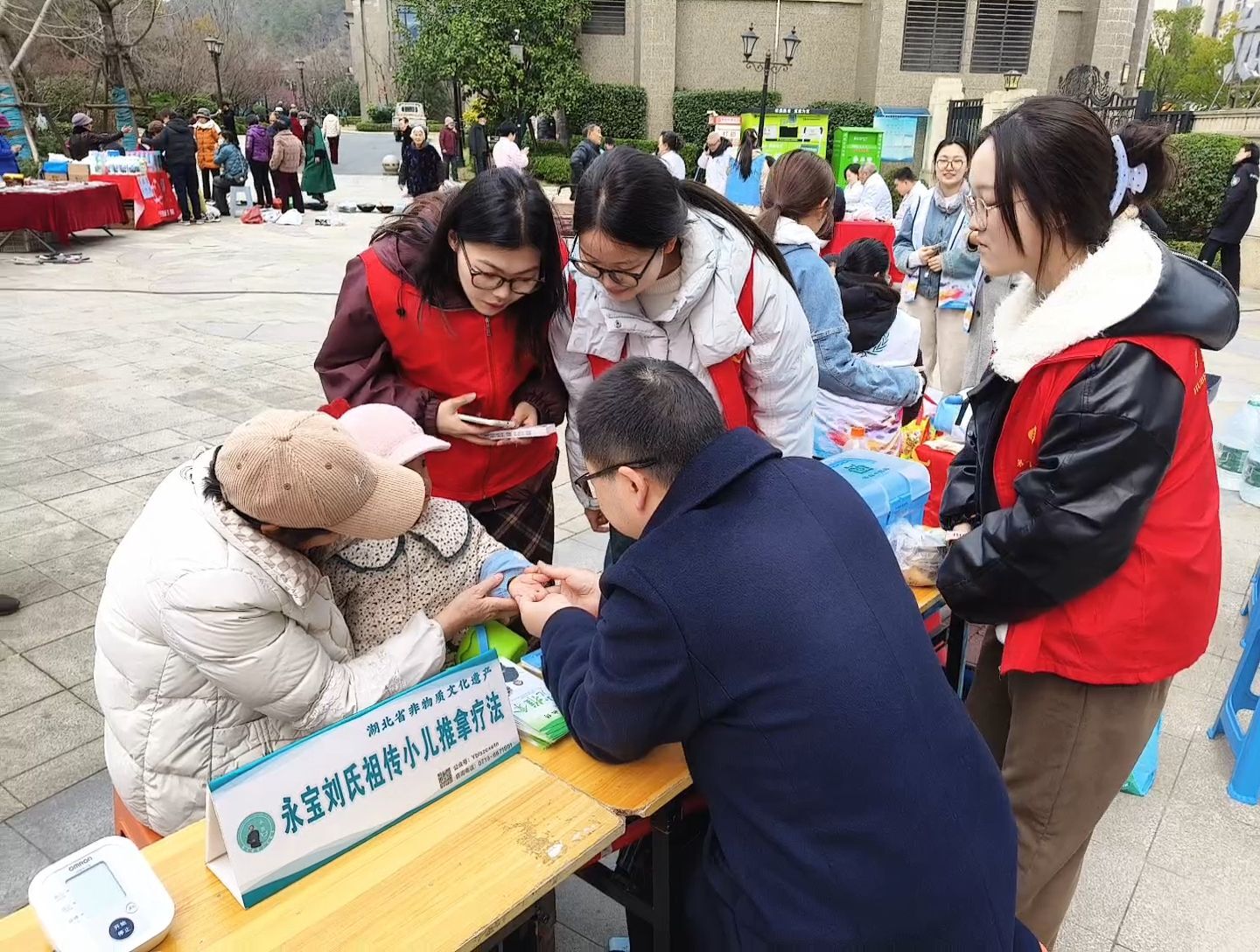 活动现场,省级非遗项目“永宝刘氏祖传小儿推拿疗法”体验区前人头攒动,小儿推拿培训老师王老师带领团队为孩子们提供免费推拿服务。只见医师们以葱姜水为介质,手法轻快柔和地在患儿穴位上点按、推拿,配合特色中药敷贴,针对小儿腹泻、厌食、咳嗽等常见病症进行调理。“不用打针吃药,推了几次孩子咳嗽就轻多了,这非遗技术太神奇了!”刚带孩子体验完的居民王女士赞不绝口。作为湖北省十佳绝活获得者,该疗法历经十六代传承,以“西医诊断为标准,中医施治为基础”的独特优势,累计治愈近80万人次,治愈率与满意度稳定在95%以上。