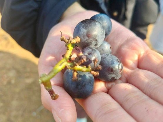 图为合作社负责人向团队展示未被霜打而残留下来的巨峰葡萄 韦彭钦摄。