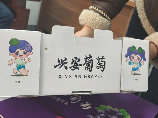 图为会长助理向团队展示在年会使用过的兴安葡萄产品包装盒和IP形象“兴兴”“安安” 肖雅萍 摄。