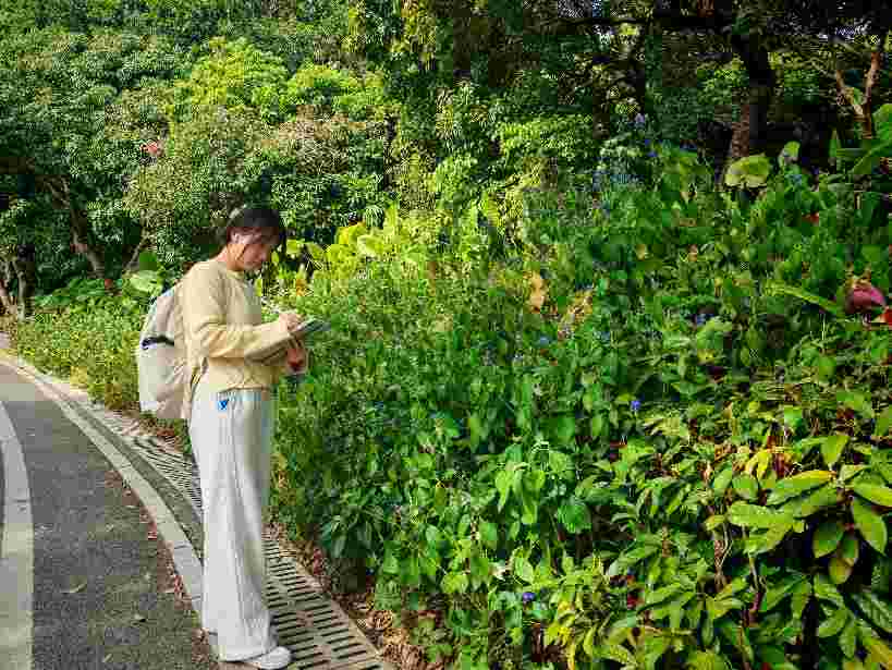图为实践队员在深圳智园翠谷公园步道旁记录观察。中国青年网通讯员傅中晨供图