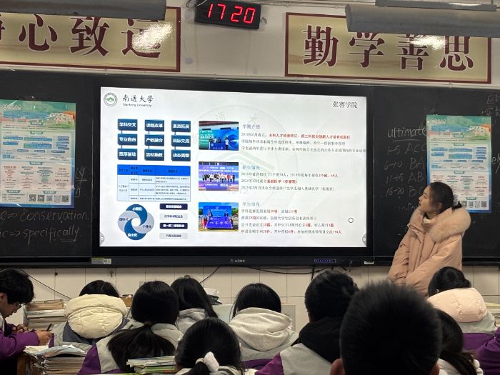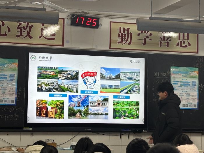 活动现场座无虚席,志愿者们以“沉浸式分享+针对性答疑”的创新形式,全方位解锁百年通大的独特魅力。宣讲伊始,团队代表从通大1912年的办学渊源切入,将张謇先生“教育救国、实业兴邦”的初心娓娓道来。配合精心剪辑的校园实拍视频与图文并茂的PPT,志愿者生动介绍了学校的综合办学实力:从ESI全球前1%的优势学科,到设施完备的实验室与藏书丰富的图书馆;从四季如画的启秀校区、现代化的啬园校区,到充满活力的启东校区,每一处场景都让在场学子心生向往。此外,志愿者还分享了通大丰富多彩的社团生活——学术类社团的科研沙龙、文艺类社团的校园晚会、体育类社团的竞技赛事,让学弟学妹们直观感受到百年学府既有深厚的人文底蕴,又有蓬勃的青春活力。