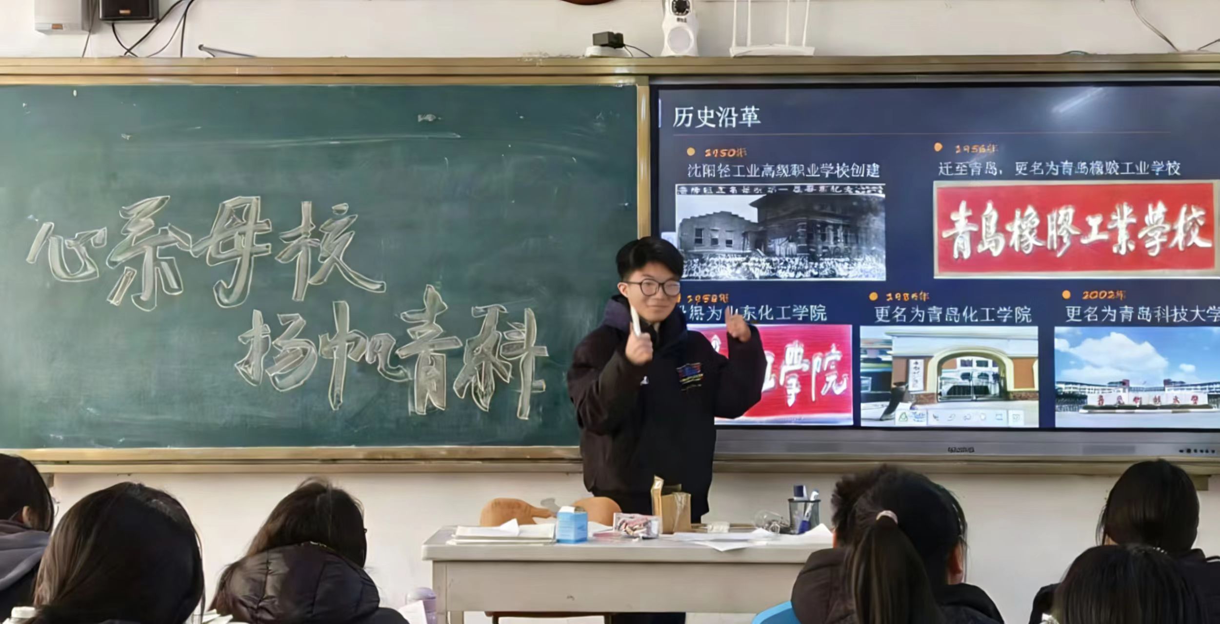 一、校史溯源:赓续初心使命 传承青科精神 宣讲伊始,宋丙春通过精心制作的PPT,带领同学们回溯了青岛科技大学七十余年的七十余载的奋斗征程。从1950年沈阳轻工业高级职业学校奠基启航,到如今获评“橡胶工业的黄埔军校”、发展为特色鲜明的多科性大学,学校的每一次跨越、每一步成长,都凝聚着一代代青科人的坚守与拼搏。