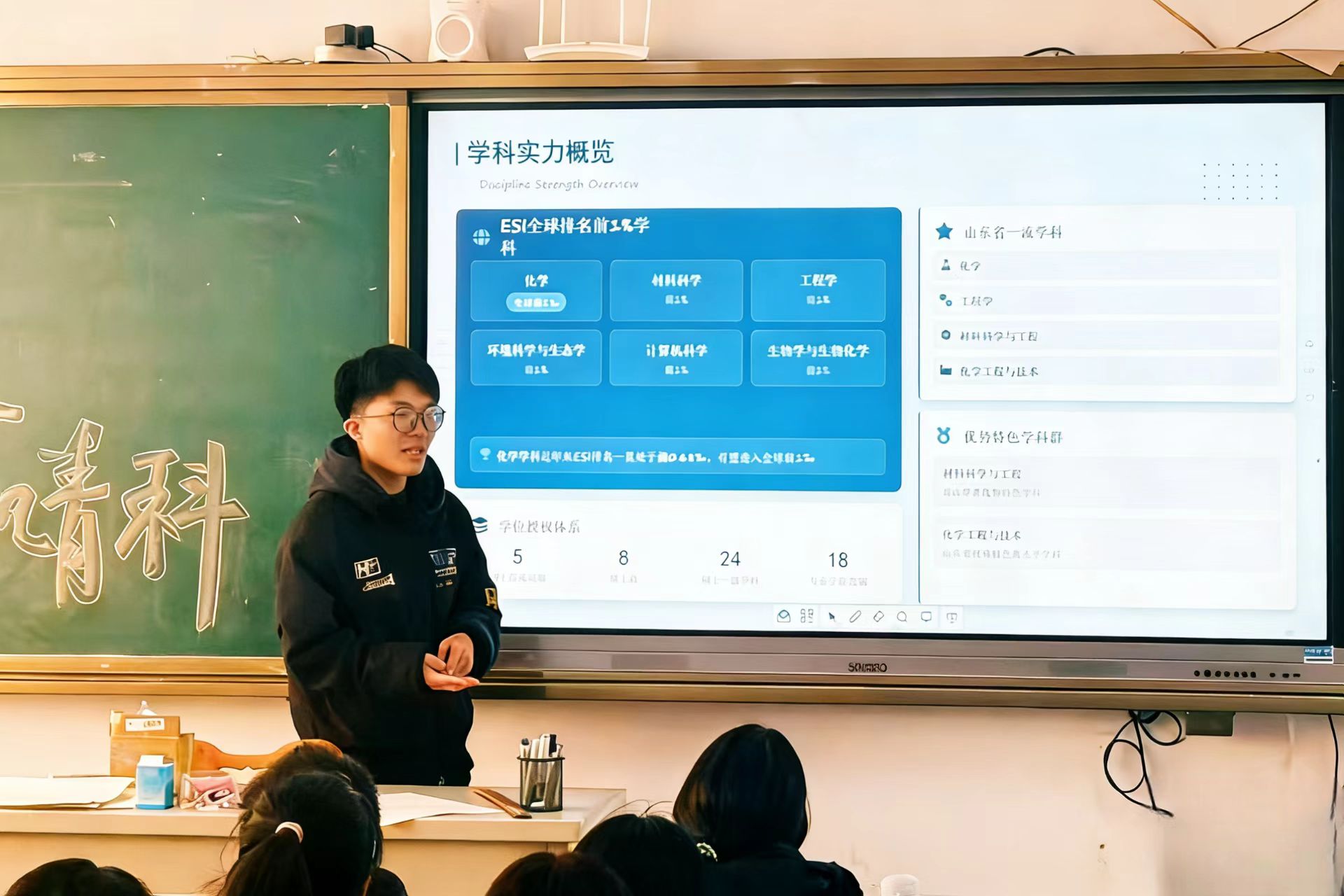二、学科领航:彰显硬核实力 赋能青春未来 在学科实力与发展前景分享环节,宋丙春聚焦学校核心优势,用详实数据与鲜活案例,为同学们展现了青科大的办学实力。学校化学、材料科学等6个学科稳居ESI全球前1%,化学工程与技术、材料科学与工程等4个学科入选山东省一流学科,依托“泰山学者优势特色学科”等优质平台,为青年学子提供了前沿科研资源与广阔成长空间。