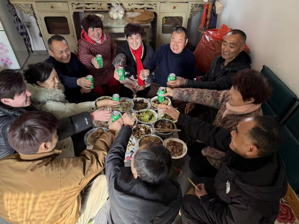 图为实践团成员和家庭成员一同吃团圆餐。谢子航 供图