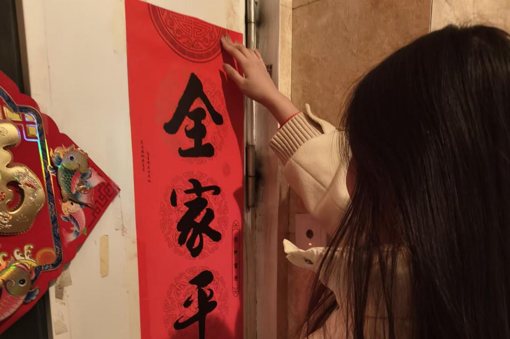 图为实践团成员贴春联。林紫琪 供图