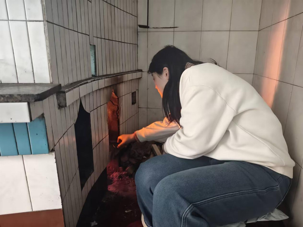图为实践团成员在老灶台烧火。贾柯霓 供图