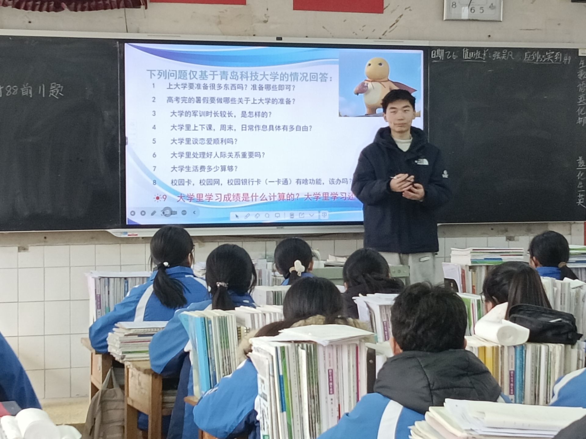 青科的橡胶品格铸就了我,因此我也很认真地提前一个月就筹备这项活动,不负大学与母校对我的期待。我制作了包含青岛科技大学发展历程、校园风光、专业介绍、丰富多彩的社团活动以及高考备考经验的PPT。为了缓解学弟学妹们的紧张情绪,我还设计了互动提问和颁发奖品的环节,奖品有棒棒糖和青科大标识校徽,在互动提问环节,我也积极地去弘扬大学积极正确的价值观正能量!