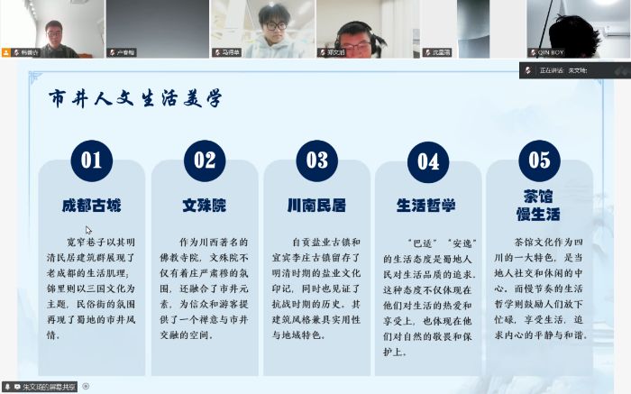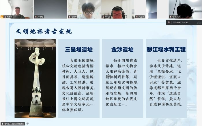 镇江江苏科技大学1月22日电 为了让更多青年学子领略巴蜀文化的深厚底蕴与独特魅力,凝聚文化传承力量,近日,巴蜀烟火实践团以线上腾讯会议为载体,成功举办了主题为“巴蜀烟火,岁月沉香”的宣讲活动。来自各地的文化爱好者齐聚云端,在实践团成员朱文琦的带领下,共同开启了一场沉浸式的巴蜀文化探索之旅。