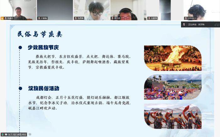 非遗文化环节,实践团成员重点介绍了三类非遗项目。川剧变脸、四川清音等戏曲曲艺韵味十足;蜀绣蜀锦、自贡彩灯等传统手工技艺巧夺天工;彝族火把节、成都灯会等民俗节庆多姿多彩,彰显非遗文化的强大生命力。